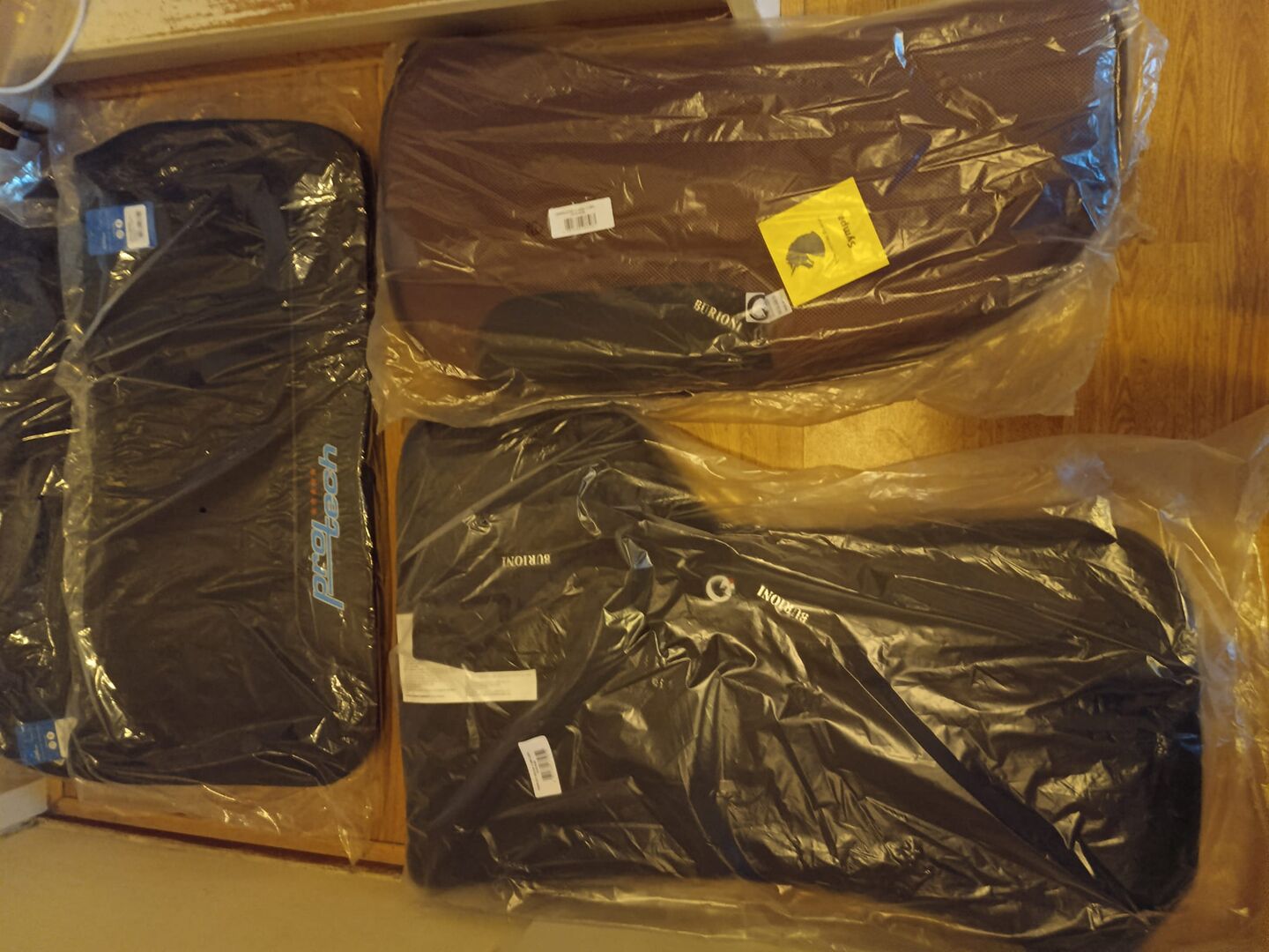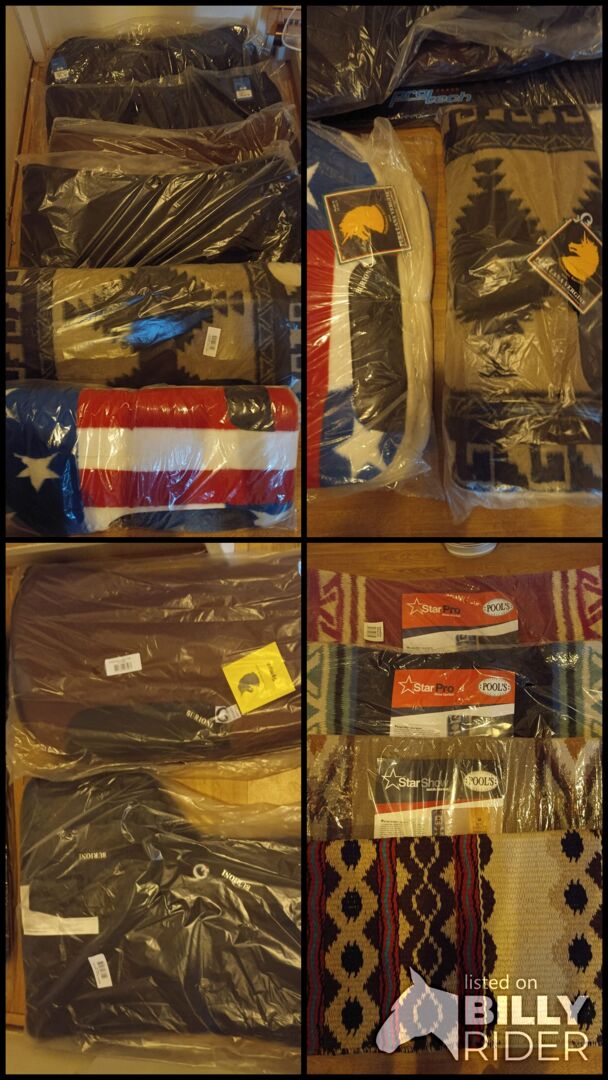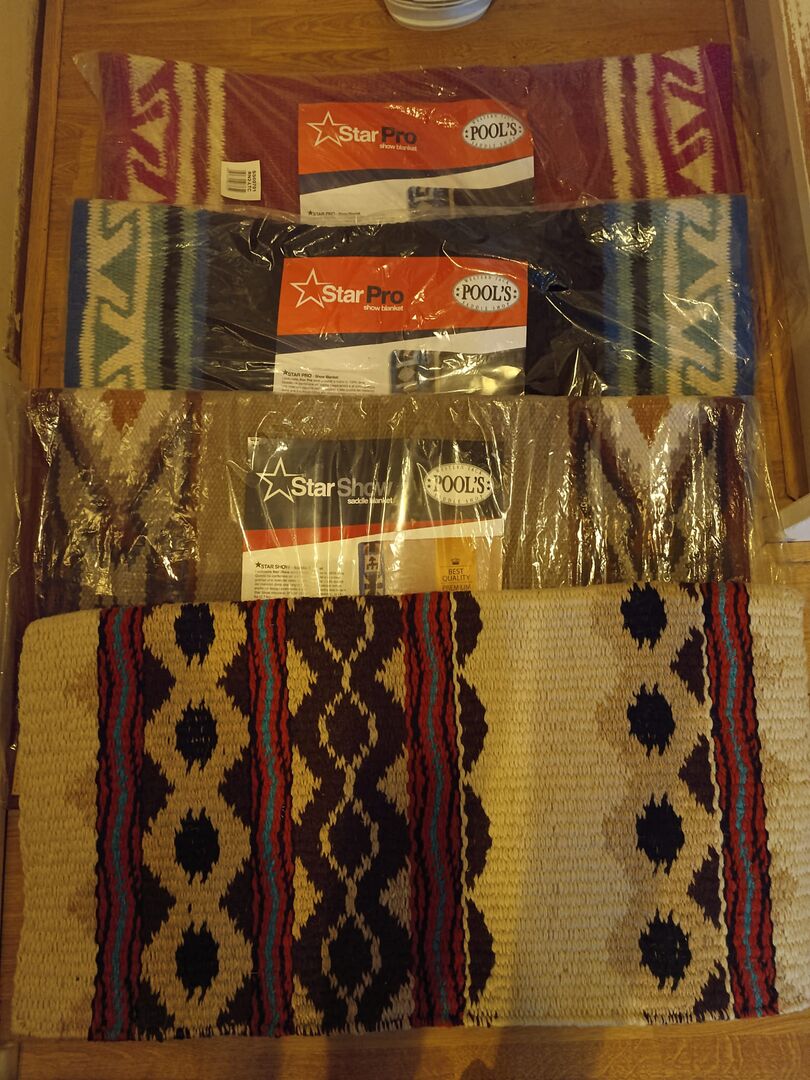 Dodatkowo mam 4 koce. Koce są nowe; dwa zostały wypróbowane na koniu, a pozostałe dwa są nadal w oryginalnym opakowaniu. Są to piękne derki. Górna na zdjęciu to Pools Star Pro w kolorze różowym/białym/szarym. Poniżej znajduje się derka Pools Star Pro w kolorze niebieskim/zielonym/czarnym/białym. Trzeci to Pools Star Show w kolorze brązowym/szarym/białym/czarnym. Ostatni to model innej marki w kolorze kremowym/beżowym/czarnym/czerwonym/niebieskim.