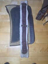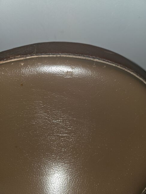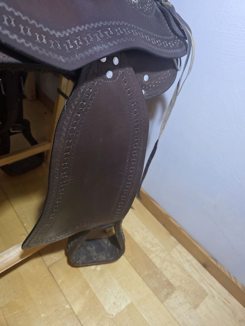 Cechy szczególne i wymiary: Rozmiar siedziska: 17 cali Długość całkowita: ok. 65 cm Wygląd: Ciemnobrązowa skóra wysokiej jakości z pięknymi dziurkowanymi krawędziami i srebrnymi konchami. Stan: Używany, ale w bardzo dobrym stanie (patrz zdjęcia). Skóra jest miękka, a tapicerka nienaruszona.