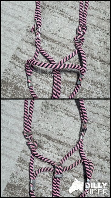 Zawieszka z węzłem - Używany, ale bardzo dobrze zachowany wiązany halter w kolorze różowo-czarnym z metalowym pierścieniem pod brodą. Bez wad Rozmiar: pełny VB 18,00