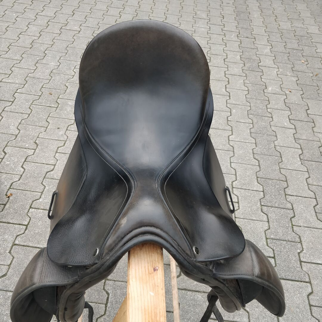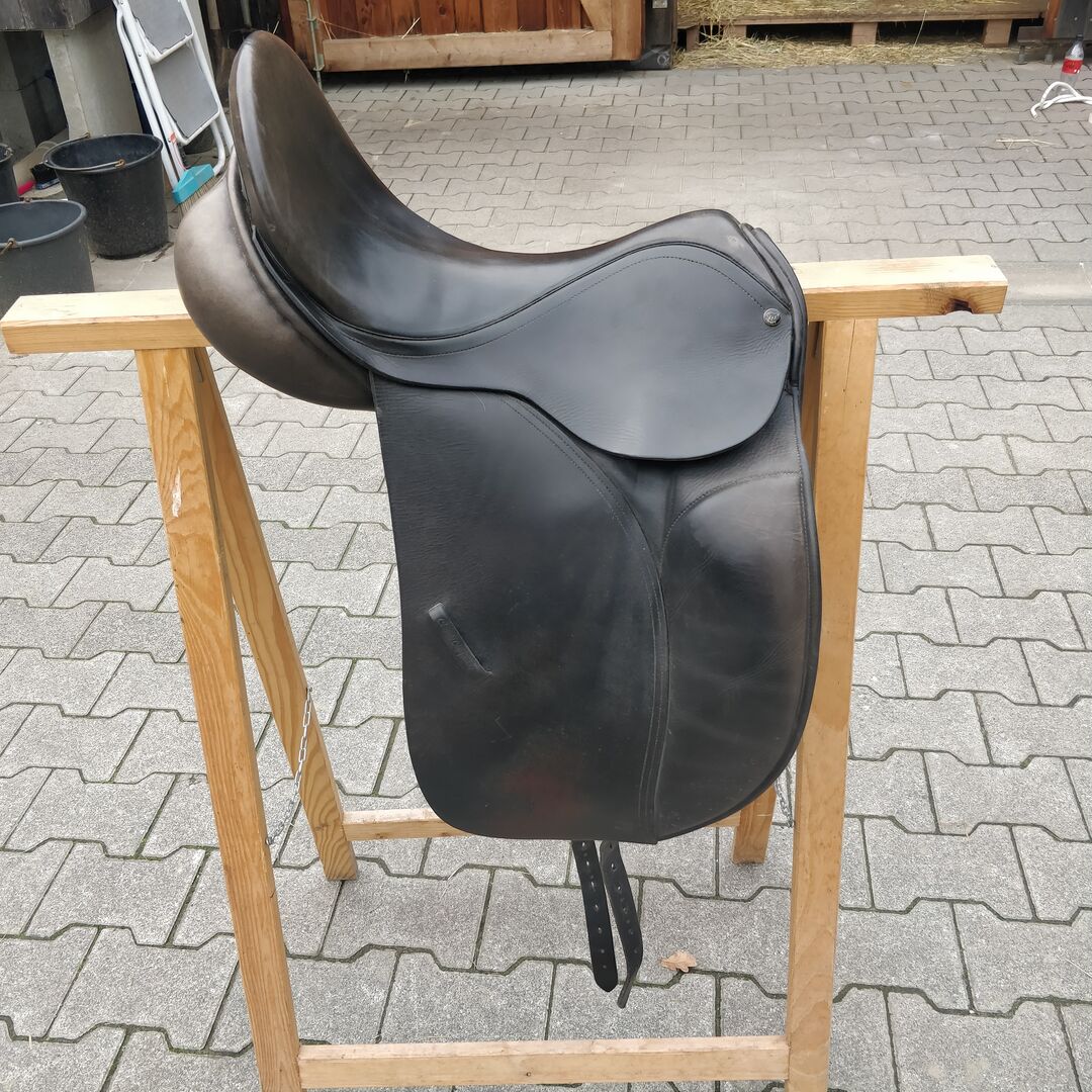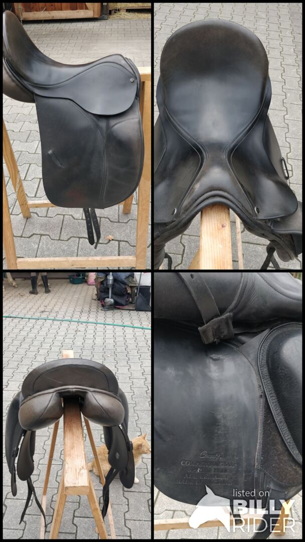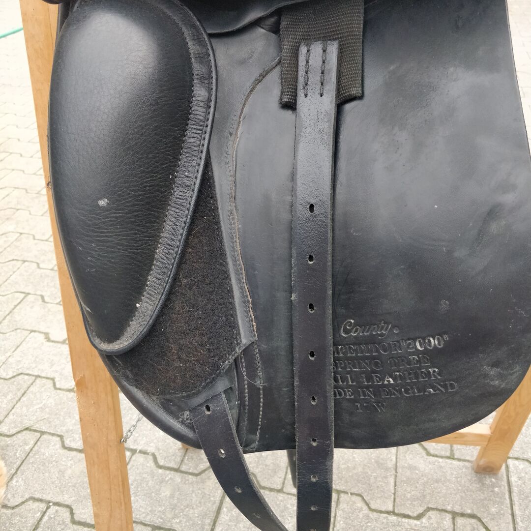 Zawodnik okręgowy 17 cali - Dobrze używane siodło ujeżdżeniowe County. Oczywiście ma kilka dziwactw, ale funkcja jest dobra. Był używany na kucyku End Mass.wyściółka jest miękka. Został przerobiony przez rymarza na panele na rzepy.9.