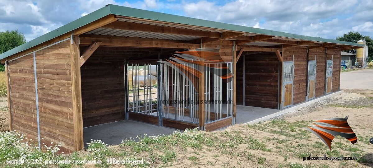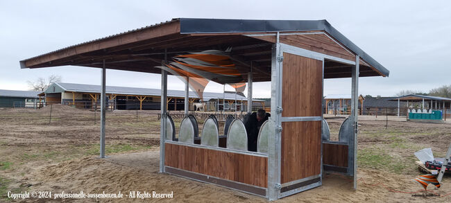 AUSSENBOXEN oferuje wysokiej jakości wiaty i zadaszenia dla koni, idealne na pastwiska, padoki i obszary karmienia.