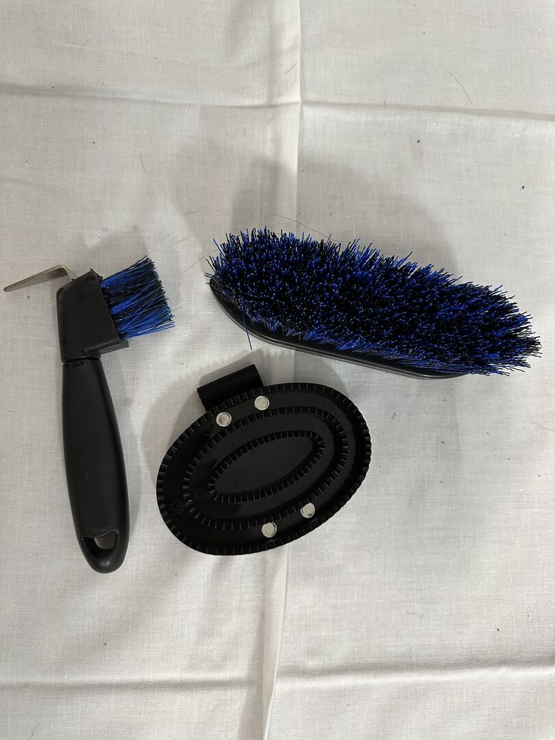 Zestaw czyszczący - Zestaw do pielęgnacji (skrobak do kopyt, szczotka do korzeni, plastikowy grzebień do curry) Czarny/niebieski z kolorowymi brokatowymi kamieniami (wszystko włączone) Kupiony, ale nigdy nie używany.