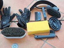 Zestaw do pielęgnacji koni, pielęgnacja - Zestaw do czyszczenia składa się z - Grzebień do potu - skrobak do kopyt - gąbka - Grzebień do grzywy - grzebień do curry - szczotka do pielęgnacji - Szczotka do korzeni
