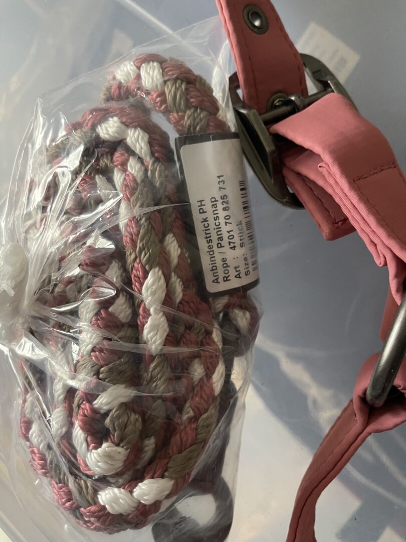 Zestaw Eskadron Rouge - Sprzedam rzadko używany zestaw Eskadron w kolorze rouge. W zestawie podkładka pod siodło w VS/WB, maska na muchy, halter+knit i bandaże w WB. Dzwonki na kopytka są w XL i mają jak widać na zdjęciu niestety oderwane szwy co nie wpływa na ich funkcjonalność.