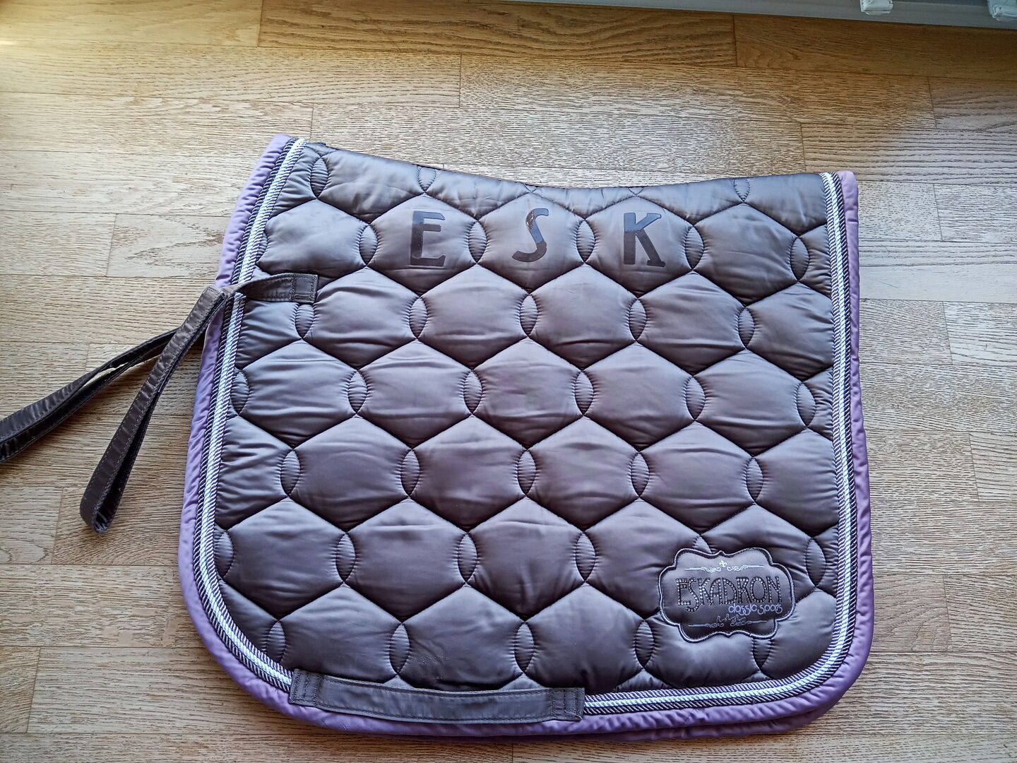 Zestaw Eskadron rozmiar kucyka - Sprzedam zestaw Eskadron w rozmiarze pony. Kolor bandaży jest fioletowy. Mają naklejki na rzepy z jednorożcem i długość 3,5 m. Podkładka pod siodło ma trójkolorowe obramowanie (fioletowy, orzechowy, biały). Posiada również nadruk żelowy i logo marki. Zestaw jest w bardzo dobrym stanie, jak nowy.