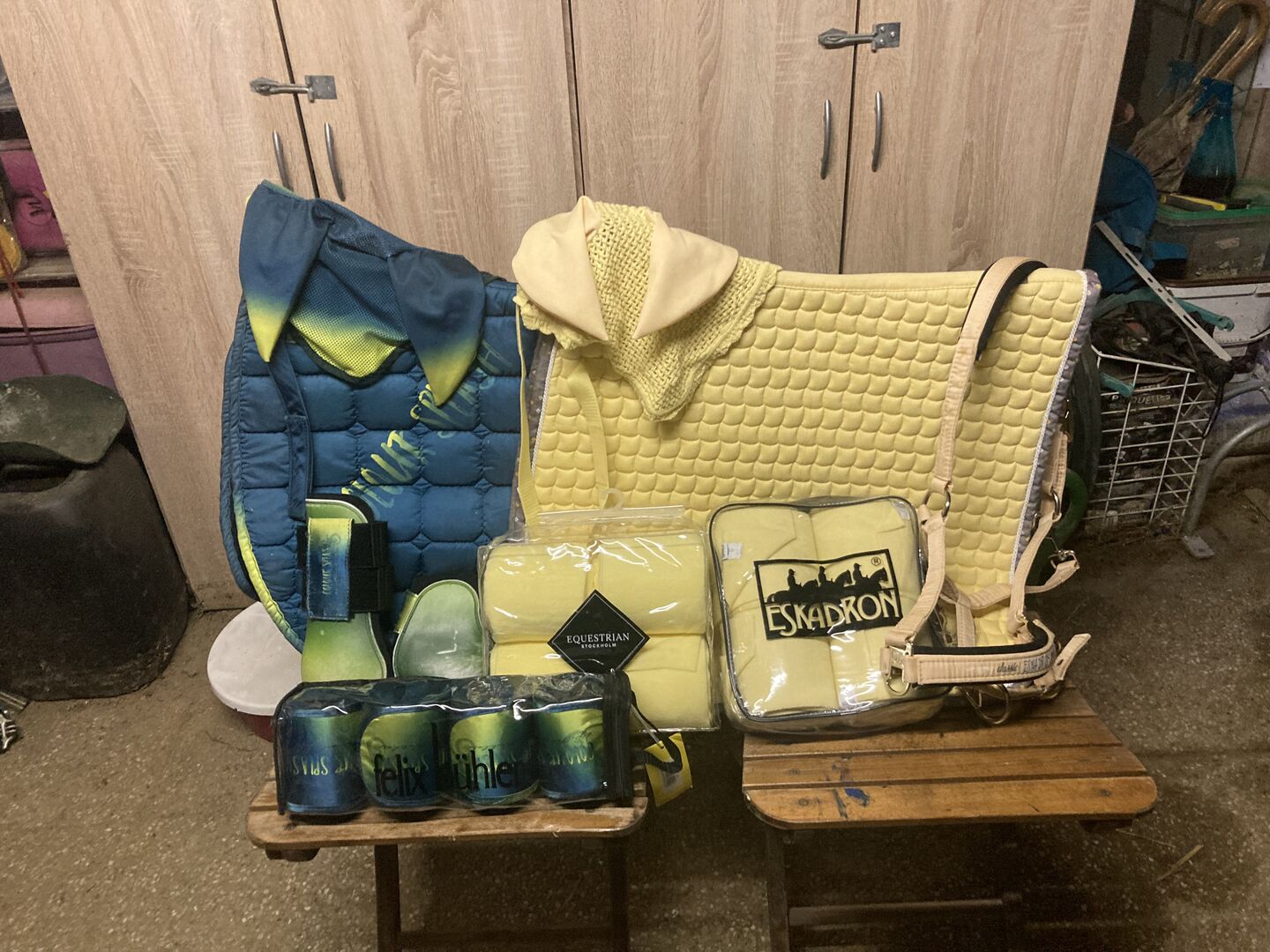 Zestaw Felix Bühler &Eskadron - Sprzedaję tę piękną kombinację kolorów jako zestaw. W skład zestawu wchodzą: 1x Felix Buehler Splash Saddle Pad DR 1x Felix Bühler Splash Bandages WB 1x Felix Bühler Splash fly bonnet WB 1x Felix Bühler Splash Gaiters WB 1x Equestrian Stockholm Lemon Bandages Full 1x Eskadron Nici Saddle Pad DR 1x Eskadron fly bonnet WB 1x Eskadron Bandaż WB 1x Eskadron halter WB