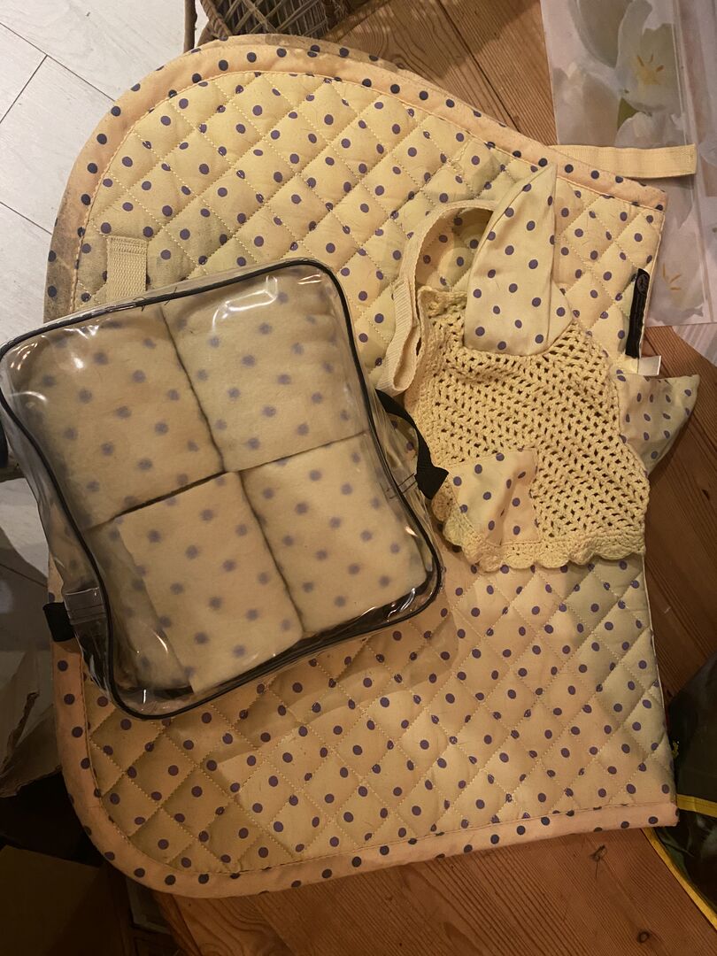 Zestaw Loesdau Podkładka pod siodło dla kucyka Bandaże na uszy - Posiada ślady użytkowania i ciemne przebarwienia, głównie od spodu. Dobrze wygląda pod siodłem na koniu. Bandaże i uszy na muchy są w dobrym stanie. Wszystko pasuje na kucyka o rozmiarze 145 cm.