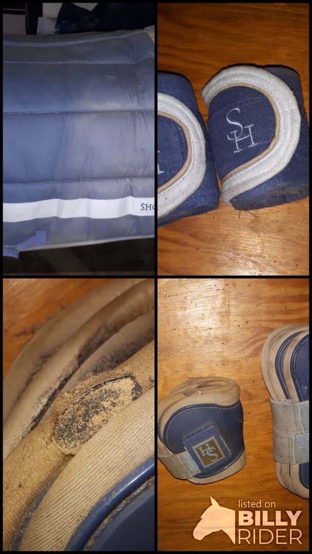 Zestaw ochraniaczy na siodło (+ getry, maska na muchy, bandaże) - Sprzedam zestaw od firmy Showmaster. Wszystko jest w rozmiarze pony. Niestety, jeden z tylnych getrów ma małą dziurkę, ale nie przeszkadza mi to. Najlepiej, aby były sprzedawane jako zestaw.