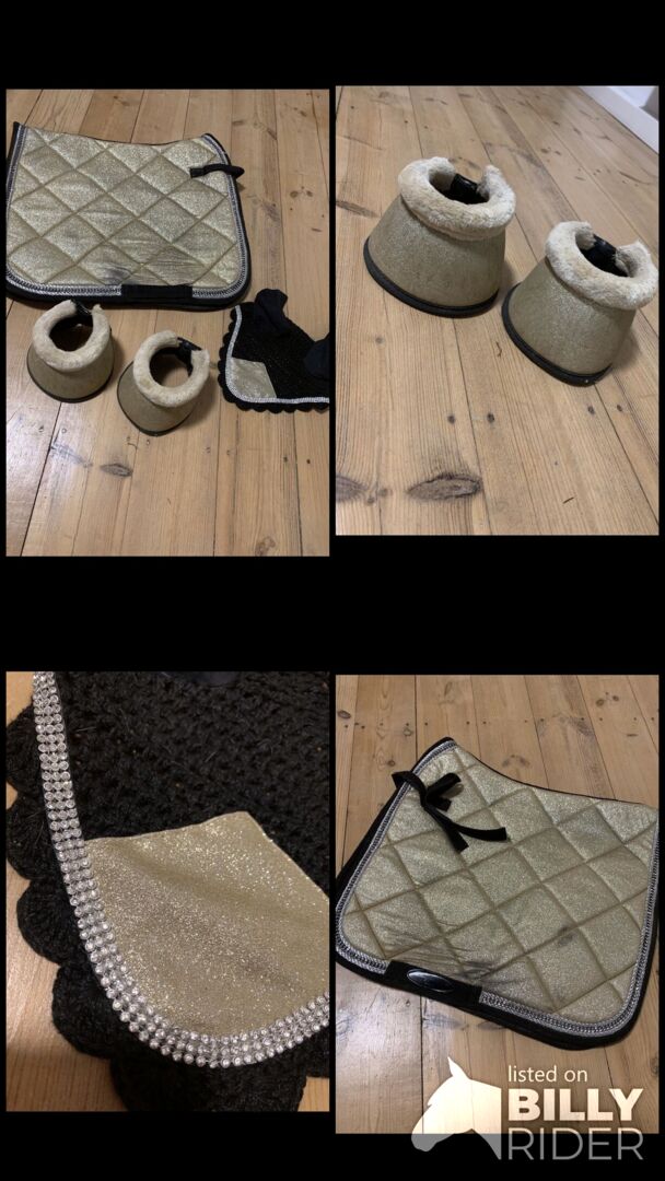 Zestaw podkładek pod siodło złoty - Sprzedam tu dobrze zachowany komplet siodła - podkładka pod siodło - dzwonki na kopyta - kaptur na muchy. Również do sprzedaży indywidualnie.