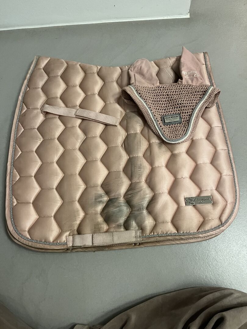Zestaw Showmaster - Sprzedam zestaw Showmaster w kolorze różowym. Podkładka pod siodło jest w rozmiarze DL, a maska na muchy jest w rozmiarze pony (ale jest bardzo elastyczna). Podkładka pod siodło ma niewielkie ślady od siodła, ale nie widać ich podczas jazdy.