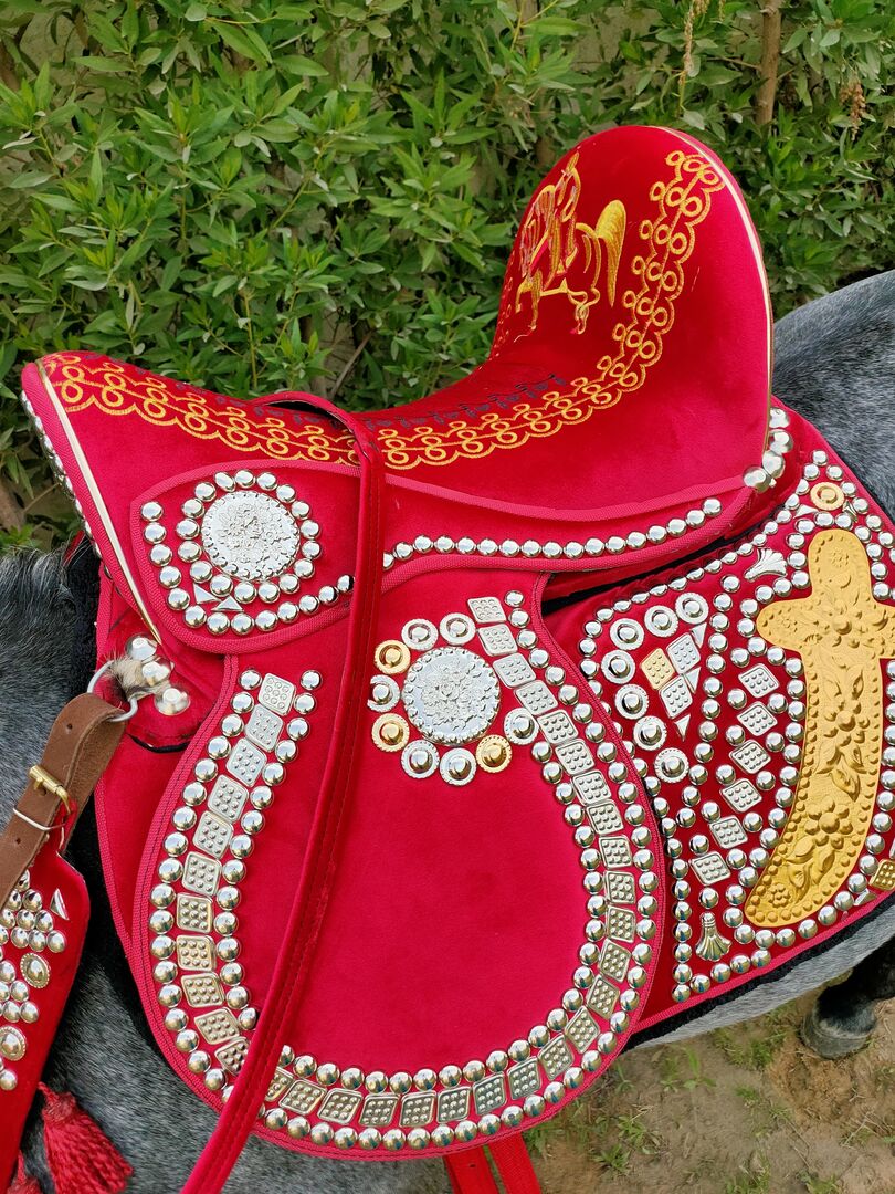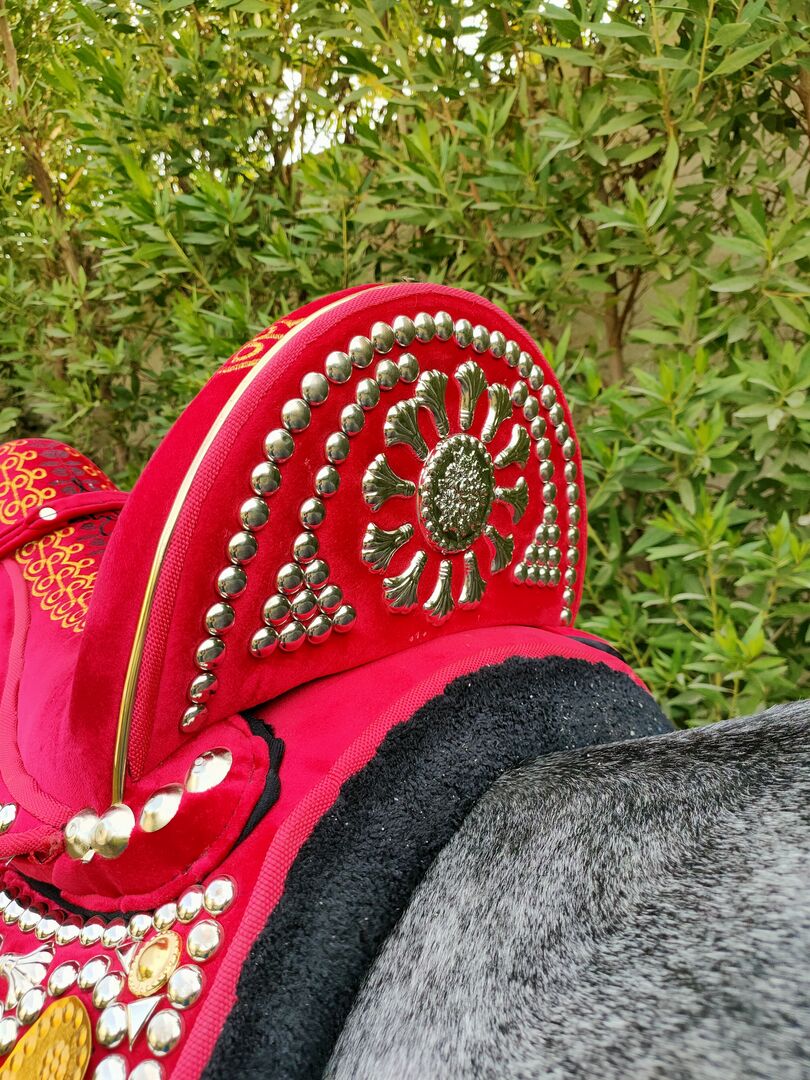 Powierzchnia styku z koniem jest miękka, wyściełana i idealnie dopasowana do grzbietu konia. Siodło i akcesoria są wykonane ręcznie i dlatego są unikalne. Brakuje kilku części ornamentu po lewej stronie. ( patrz zdjęcie 16 )