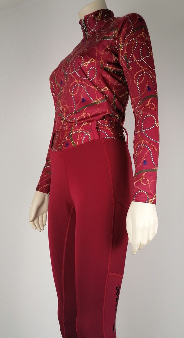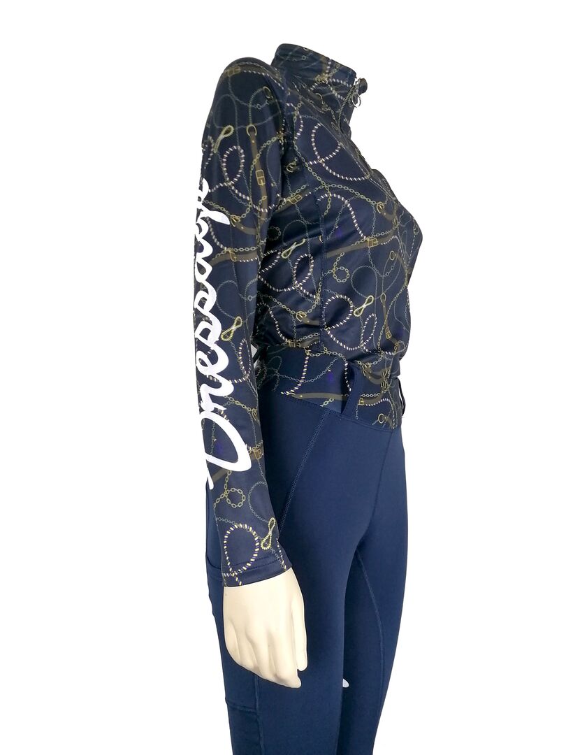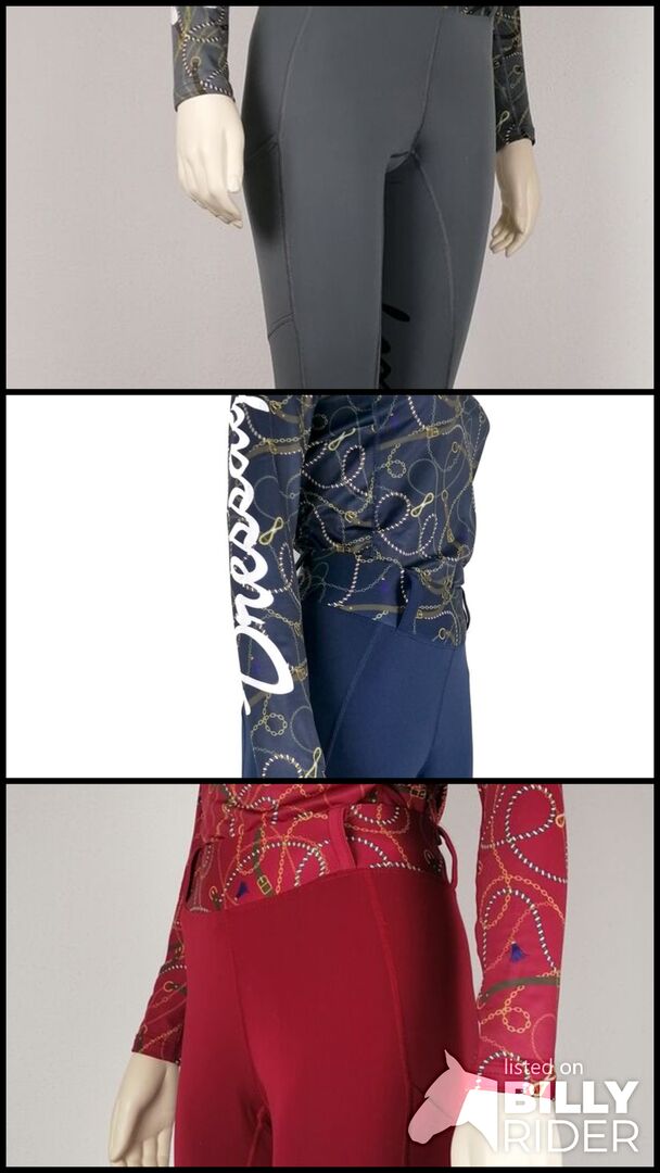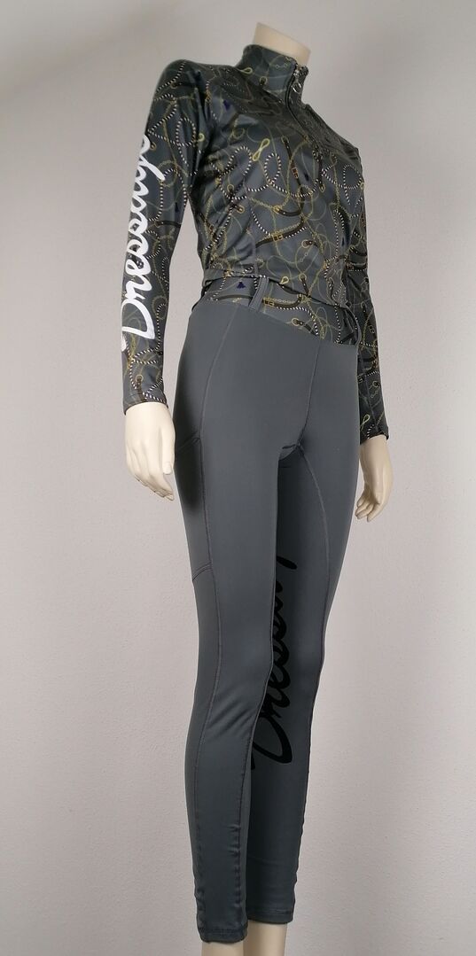 Zestaw ujeżdżeniowy 2 legginsy i koszulka z podkładem - Ten zestaw składa się z legginsów do jazdy konnej i pasującej do nich koszulki z warstwą podstawową. Eleganckie legginsy jeździeckie z silikonowym wykończeniem z napisami 3/4 High Grip zapewniają maksymalną przyjemność z jazdy. maksymalny komfort jazdy i najlepsze trzymanie w siodle. Zachowują one swój kształt, szybko schną i są bardzo łatwe w pielęgnacji. Dwie praktyczne kieszenie na telefon komórkowy, szlachetne wzornictwo, szlufki na pasek i logo ujeżdżenia dopełniają całości i stanowią obowiązkowy element garderoby każdego miłośnika ujeżdżenia. Wysoki i szeroki pas w talii, nie powoduje uczucia dyskomfortu i zwężenia w okolicy brzucha. Szybkoschnąca, UPF 50 - ochrona przeciwsłoneczna, wewnątrz aksamitnie miękka, szczotkowana. Lekki efekt kompresji 12-15 mmHg Materiał: 80 % poliamid, 20 % elastan Szwy płaskie - zamek płaski Reguluje ciśnienie krwi i pomaga rozluźnić mięśnie.