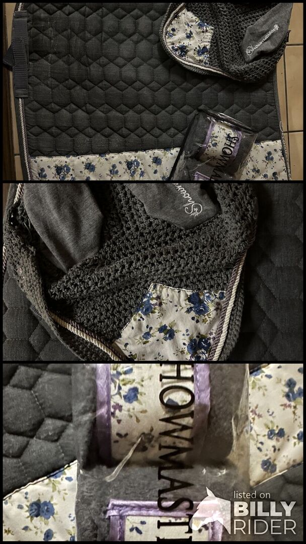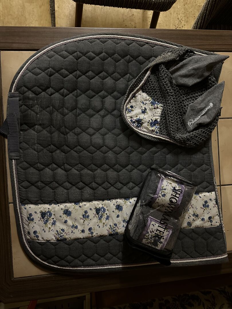 Zestaw WB (Showmaster) - Sprzedam podkładkę pod siodło + maskę na muchy + bandaże od Showmastera. (Dressage WB Fly bonnet WB Bandaże dla WB).