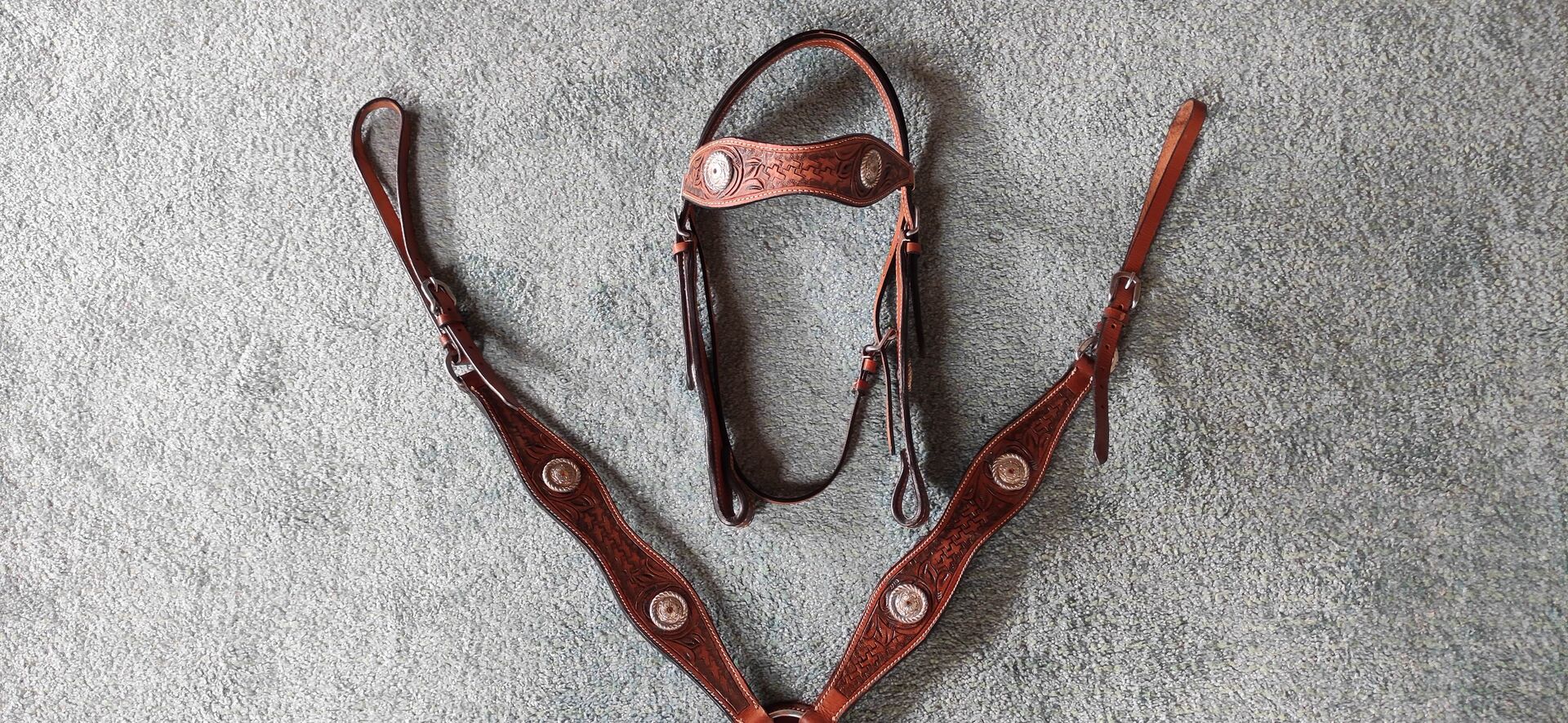 Zestaw westernowego napierśnika i napierśnika - Oferuję piękny komplet, nachrapnik i napierśnik, w kolorze miodowego brązu. Skórzany ze srebrnymi konchami z małym bursztynowym kamieniem w środku. Nigdy nie był na koniu.