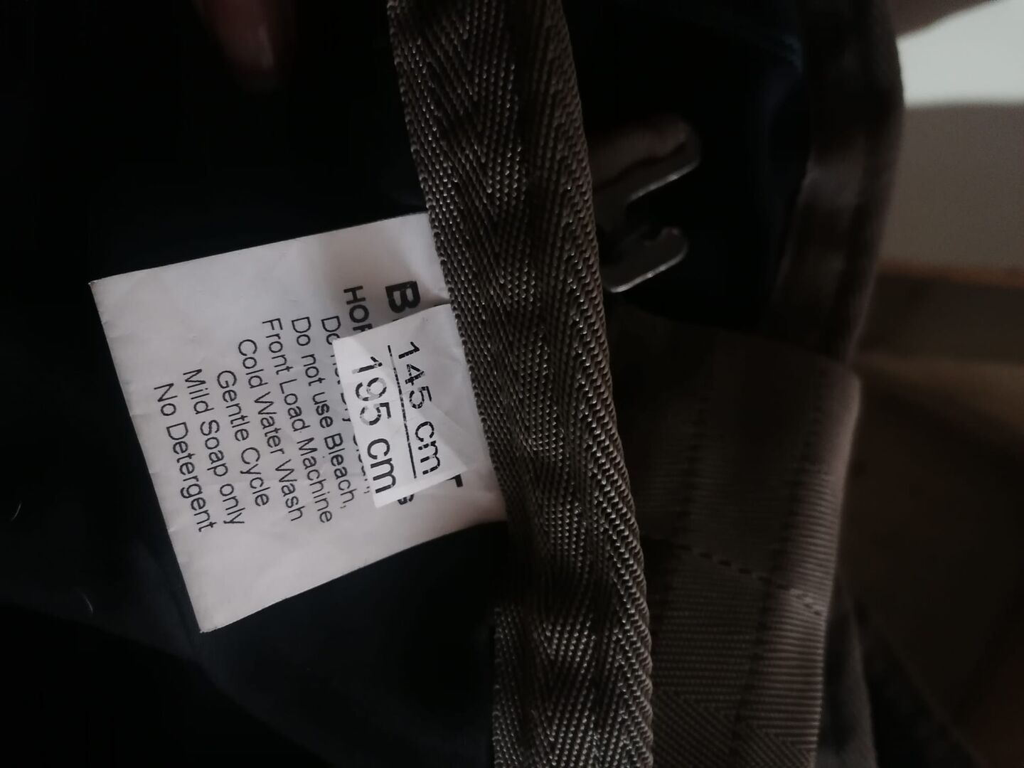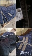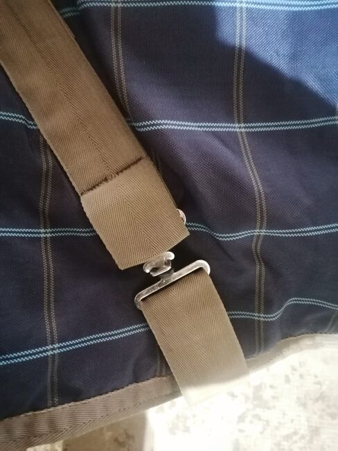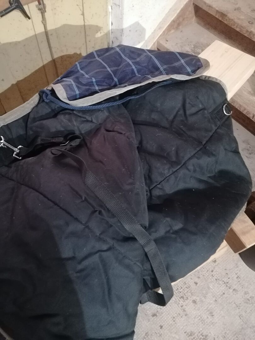 Była na koniu tylko trzy razy w celu dopasowania (więc jest na niej kilka włosów), poza tym nigdy nie była używana i dlatego jest jak nowa. Jest ciemnoniebieska z beżowym wzorem w kratkę, ma sznurki na nogi i sznurek na ogon. Dywanik można zapiąć z przodu za pomocą dwóch sprzączek i ma krzyż na brzuchu, a także klin z przodu i pokrowiec z tkaniny od wewnątrz (bez polaru).