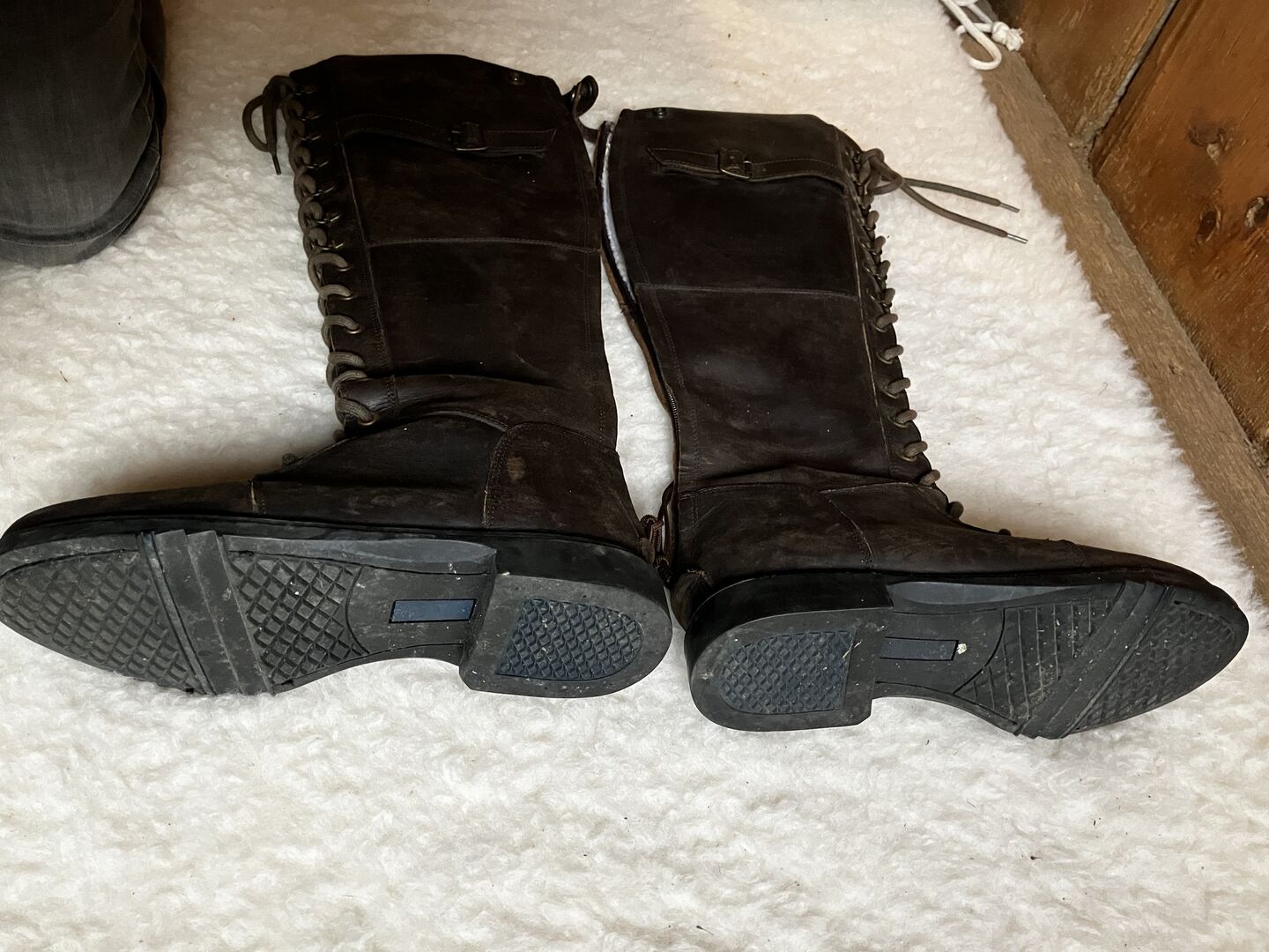 Zimowe buty do jazdy konnej - - prawie nowe, założone 3 razy, niestety były dla mnie za wysokie -wysoka retencja ciepła -syntetyczne wnętrze -materiał wierzchni wysokiej jakości skóra brązowa -syntetyczna podeszwa -zamek błyskawiczny z tyłu -miękka wyściółka -szybkie sznurowanie - wysokość 46,szerokość 37 nowa cena w pferdekram 179,-