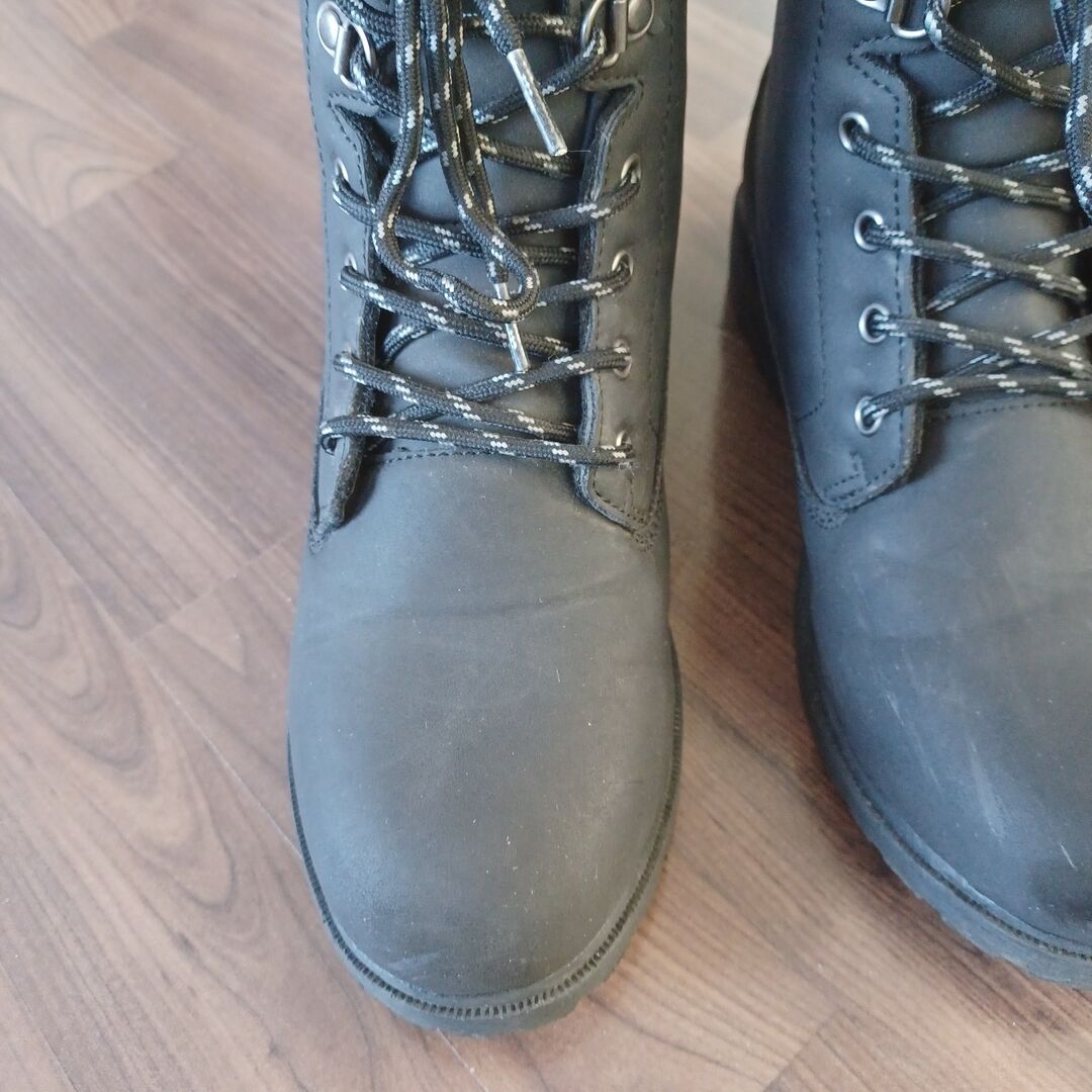 Zimowe buty jeździeckie - Sznurowane buty jeździeckie w bardzo dobrym stanie. Kilka ściągaczy na palcach buta, patrz zdjęcia. Nie wpływa to jednak na funkcjonalność. Wewnętrzna podszewka wykonana z pluszowego polaru (100% poliester) Cholewka ze skóry syntetycznej