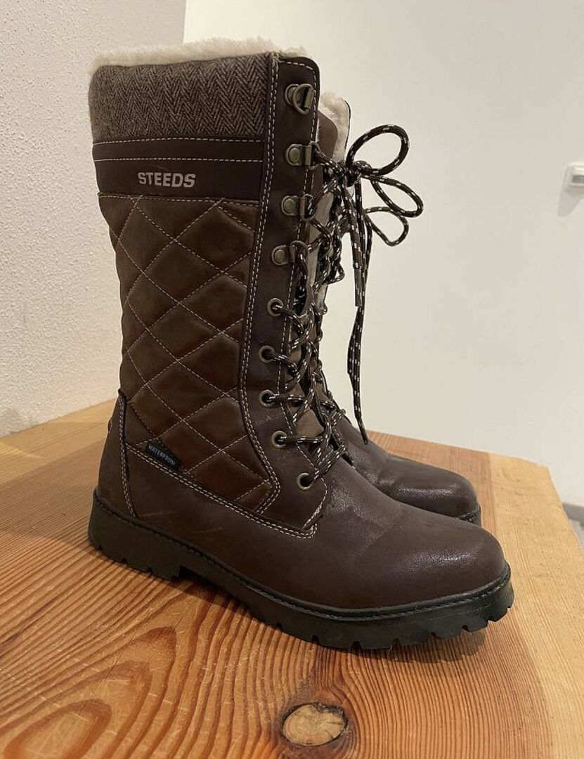 Zimowe buty stajenne - Wodoodporne zimowe buty stajenne ze sznurowaniem na całej długości. Od wewnątrz wyłożone bardzo miękkim polarem (100% poliester), który zapewnia stopom przytulność i ciepło. Zintegrowana wodoodporna membrana i zszywany język buta z boku zapobiegają przedostawaniu się śniegu lub wody. Elegancki wygląd dzięki tekstylnej wstawce na końcu cholewki i przyciągającym wzrok kontrastowym szwom. Szybkie sznurowanie ułatwia zakładanie i zdejmowanie. Bieżnikowana podeszwa zapewnia dobrą przyczepność nawet na oblodzonych nawierzchniach. Materiał cholewki: poliuretan.