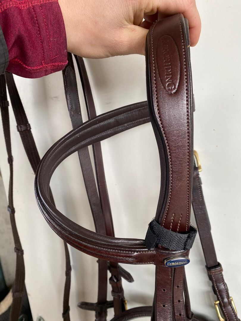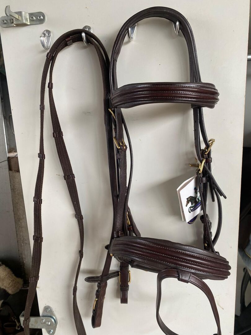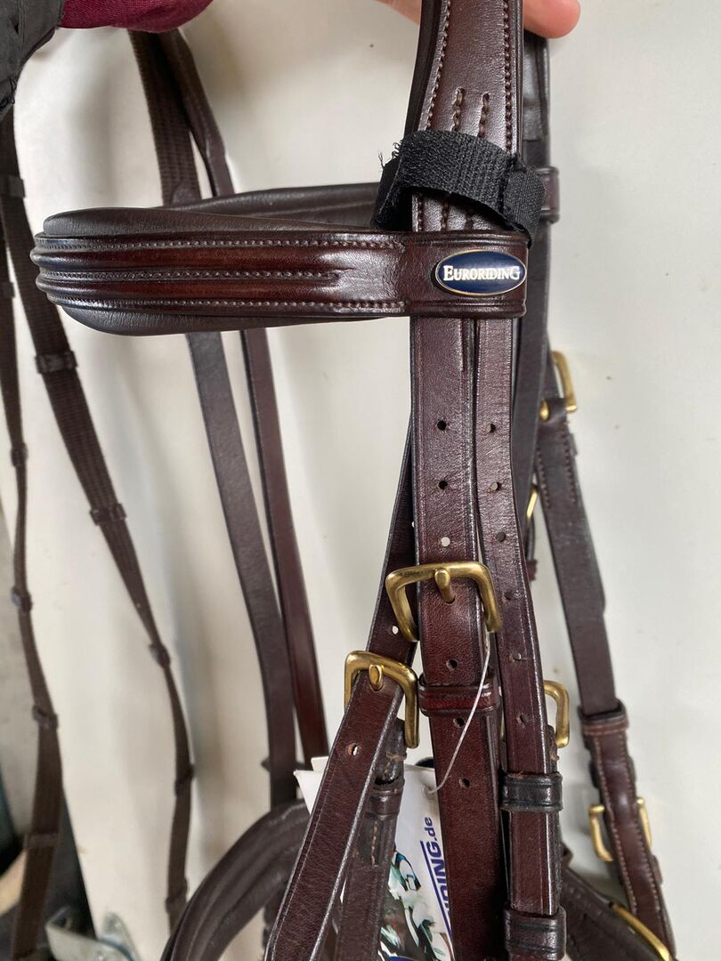 Znakomity nowy werbel w rozmiarze VB - Nowy ciemnobrązowy snaffle firmy Euroriding w rozmiarze dla koni pełnej krwi. Dobrze wyściełane i z pięknymi złotymi okuciami. W komplecie z pasującymi szelkami. NP: 99,95