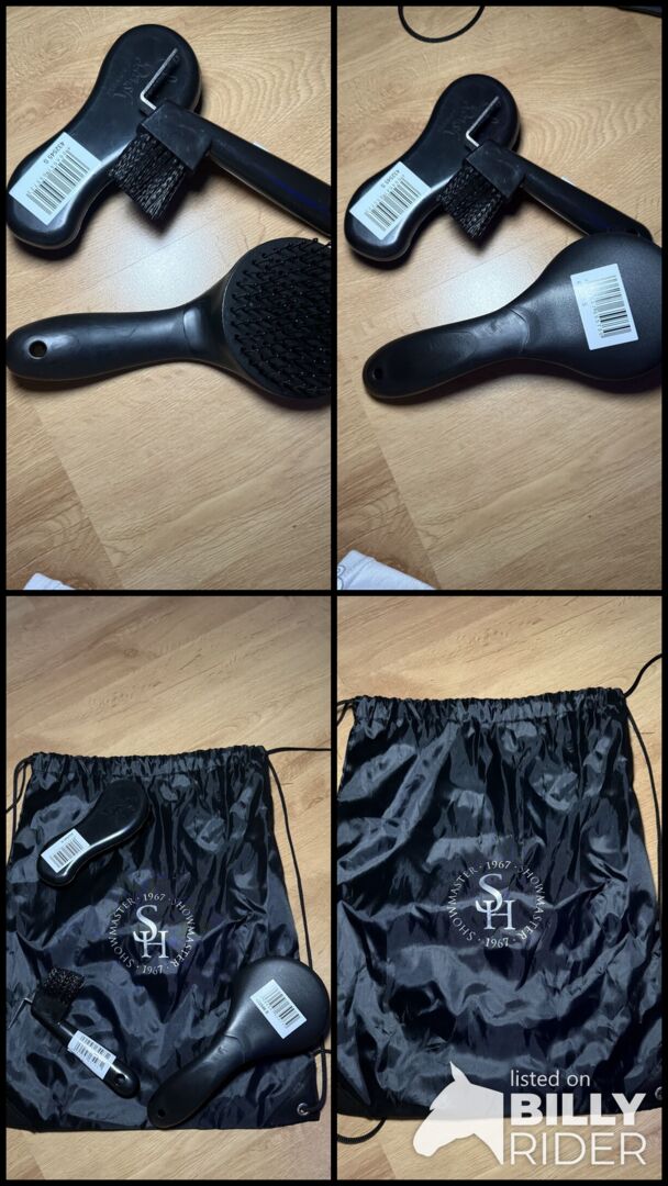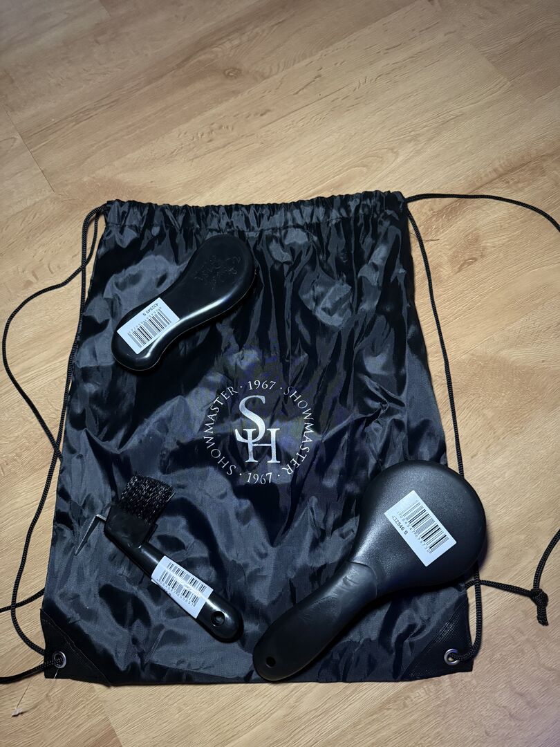 Zupełnie nowy zestaw czyszczący - Sprzedaję nowy i nieużywany zestaw pielęgnacyjny firmy Showmaster. Zestaw zawiera zgrzebło do kopyt, szczotkę do grzywy i zwykłą szczotkę. W zestawie znajduje się również torba gimnastyczna.